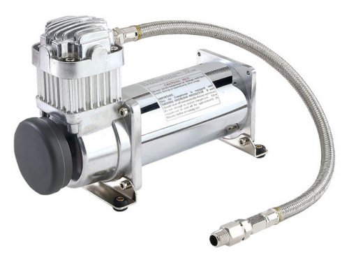 s a truly-rated continuous duty, 12-volt, 200 PSI compressor. It is capable of filling a 5-gallon tank from 165 PSI to 200 PSI in 3-1/2 minutes consistently, while never pulling more than 16 amps of power (@ 13.8 volts). It is the choice for those who wish to keep the strain on their vehicles' charging systems to a minimum. Features include a standard 1/4" stainless steel braided leader hose with inline check valve and insulated wiring for simple installation.